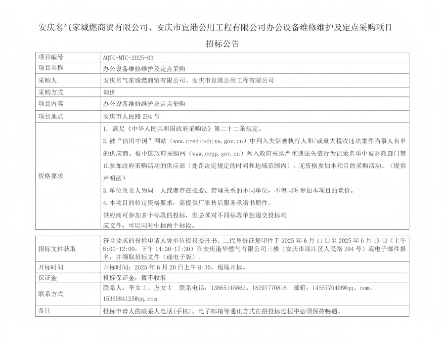 安慶名氣家城燃商貿(mào)有限公司、安慶市宜港公用工程有限公司辦公設(shè)備維修維護(hù)及定點(diǎn)采購(gòu)招標(biāo)公告