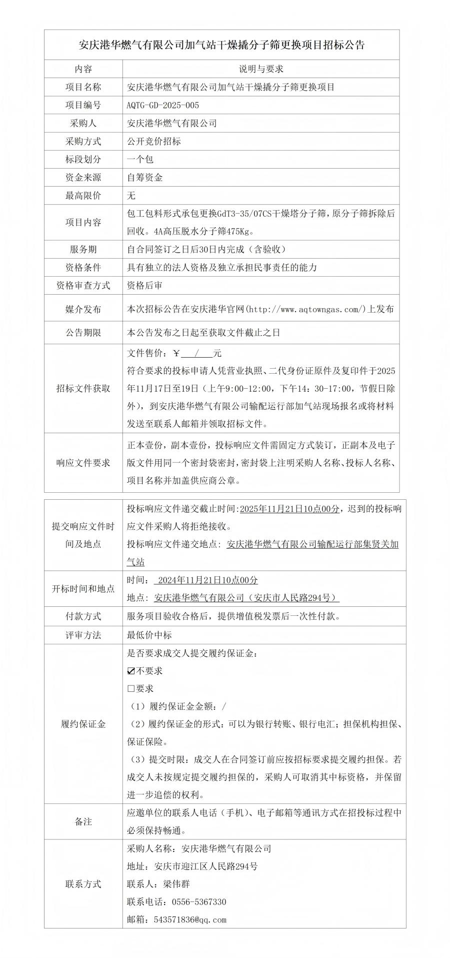 安慶港華燃氣有限公司加氣站干燥撬分子篩更換項目招標公告