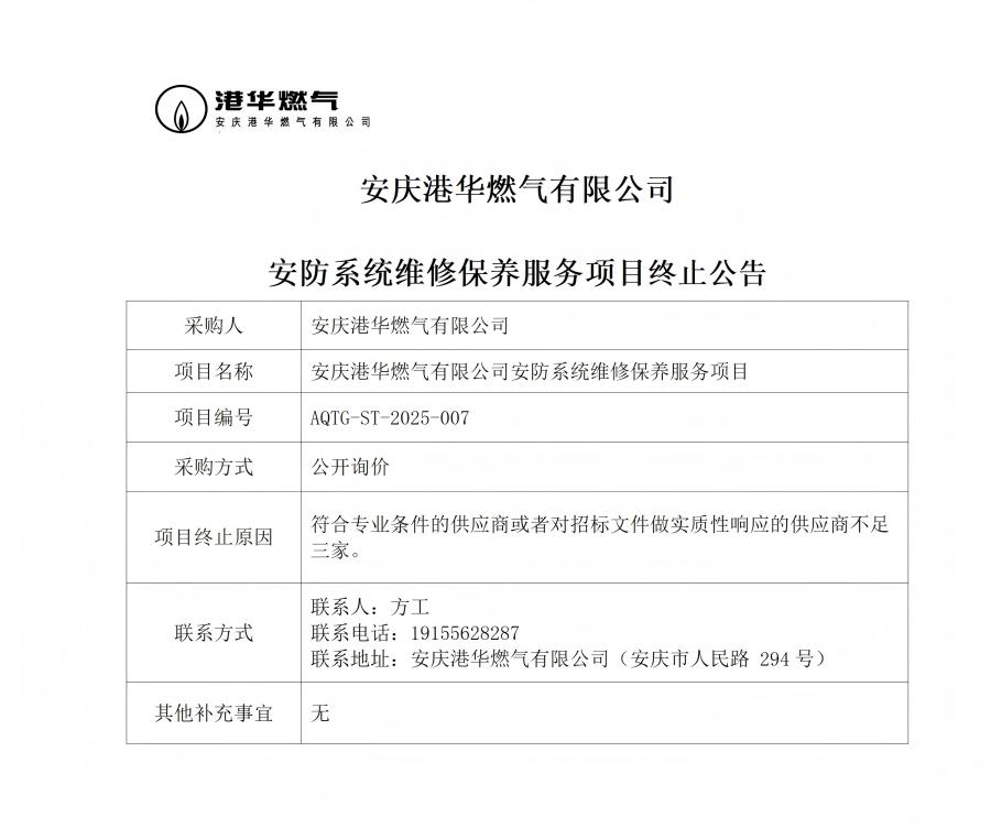 安慶港華燃?xì)庥邢薰景卜老到y(tǒng)維修保養(yǎng)服務(wù)項(xiàng)目終止公告