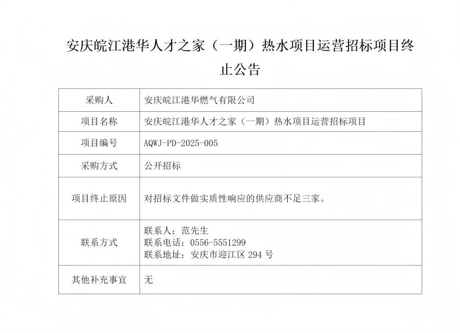 安慶皖江港華人才之家(一期)熱水項目運營招標項目終止公告