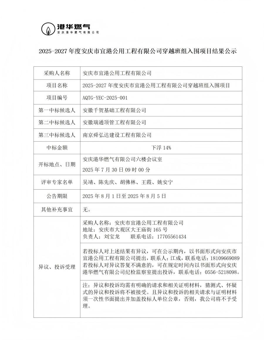 2025-2027年度安慶市宜港公用工程有限公司穿越班組入圍項目結(jié)果公示